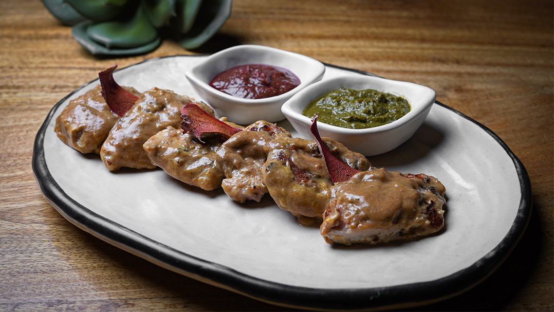 ₹ 750MINCED CHICKEN MARINATED IN HOMEMADE SPICE SERVED WITH MALABAR PARATHA AND MINT DIP [GLUTEN, NON-VEGETARIAN, DAIRY]