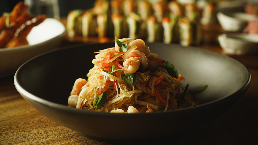 A SWEET & SPICY THAI SALAD CONSISTING OF GREEN PAPAYA, CAROT, BASIL, BELL PEPPER, SPRING ONION, CHILLI AND CRUSTED PINUTS [GLUTEN, NON- VEGETARIAN, NON-DAIRY] VEG----₹525 PRAWNS------₹599