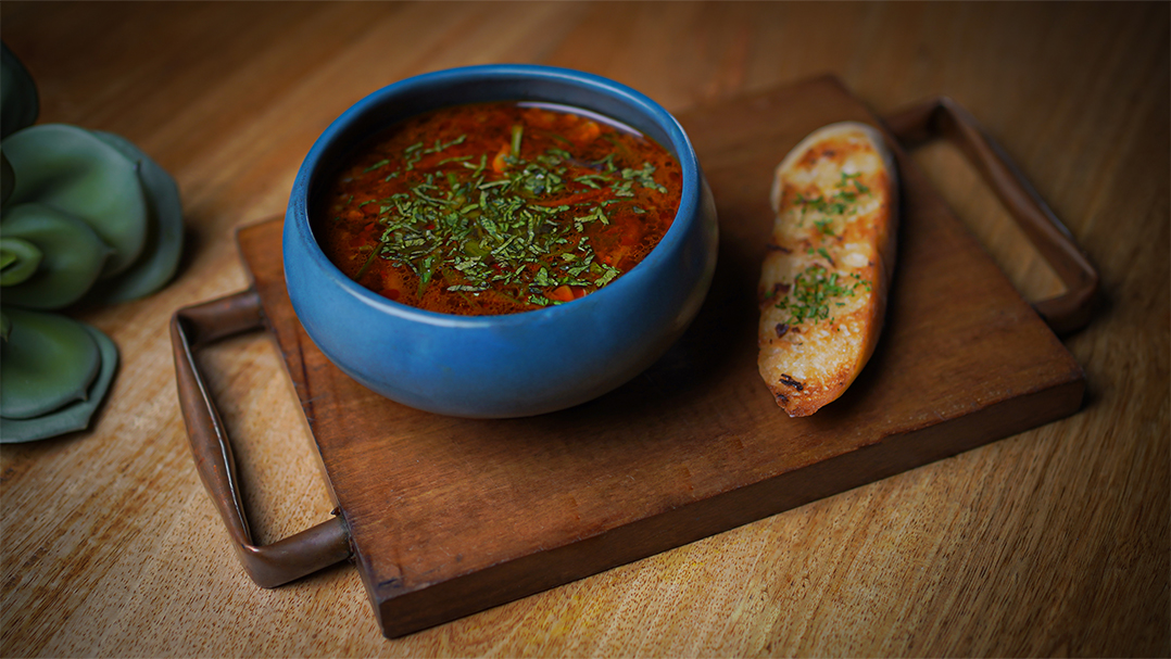 SPICY AND SOUR SOUP FLAVOURED WITH SOYA ALONG WITH CARROT, CABBAGE FRESH CHILLI, CORIANDER, MUSHROOM, ONION, GINGER GARLIC SERVED WITH GARLIC BREAD (VEG......475) (CHICKEN NV..... 525) (PRAWNS NV.....575) [GLUTEN]