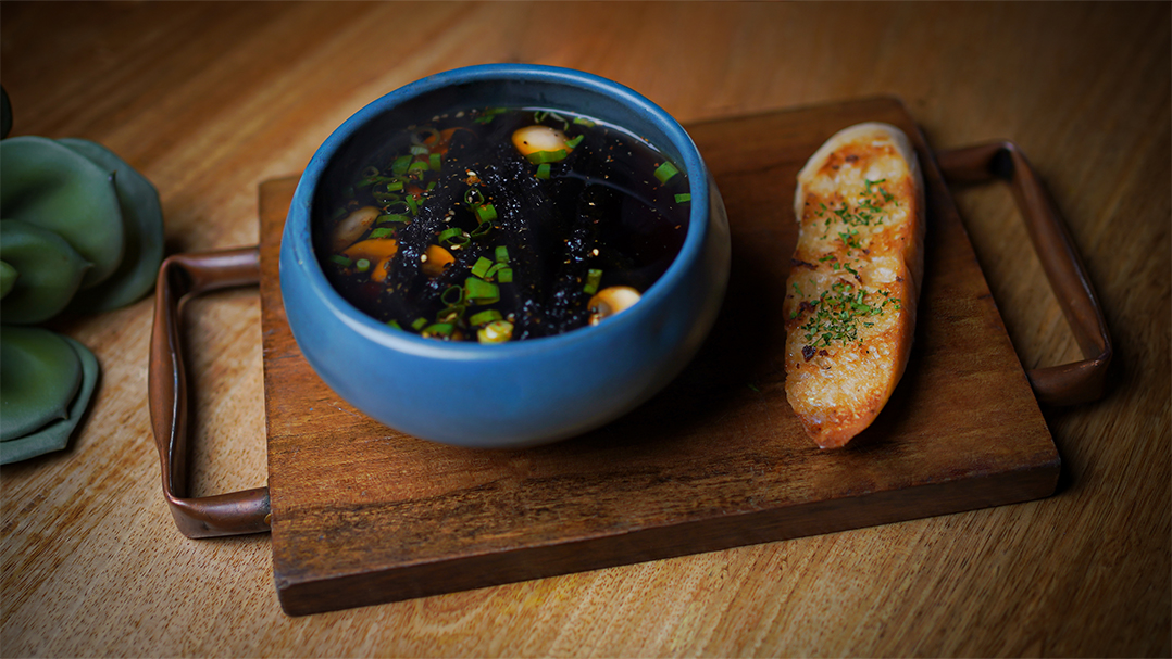 ₹ 725THE TRADITIONAL DELICATE SOYA BASE STOCK MUSHROOM NOORI SHEET, SPRING ONION, TOGARASHI SPICE JAPANESE SOUP, SERVED WITH GARLIC BREAD (VEG......475) (CHICKEN NV..... 525) (PRAWNS NV.....575) [GLUTEN]