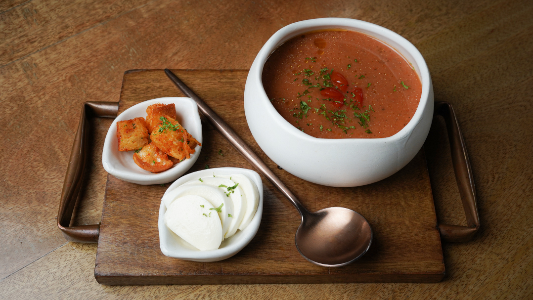 ₹525TOMATOES, CUCUMBER, RED CAPSICUM, GREEN CAPSICUM, CORIANDER, ONION, GARLIC, SALT PEPPER, OLIVE OIL, SERVED WITH BOCCOCINI, BREAD CROUTONS, [GLUTEN, VEGETARIAN]