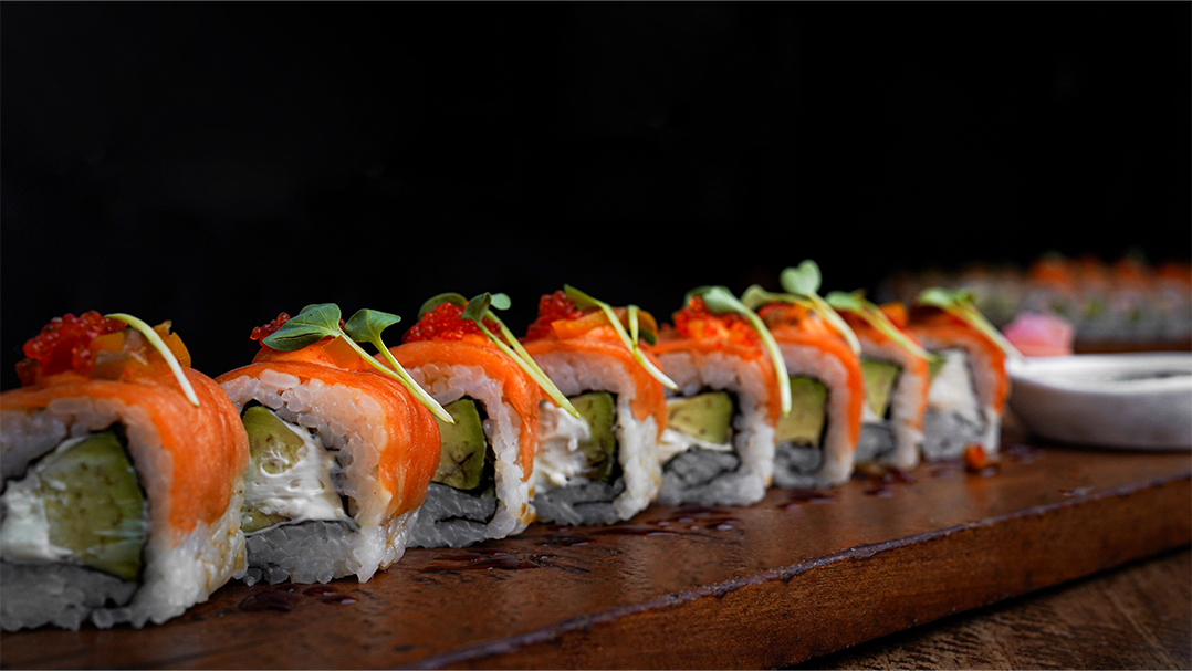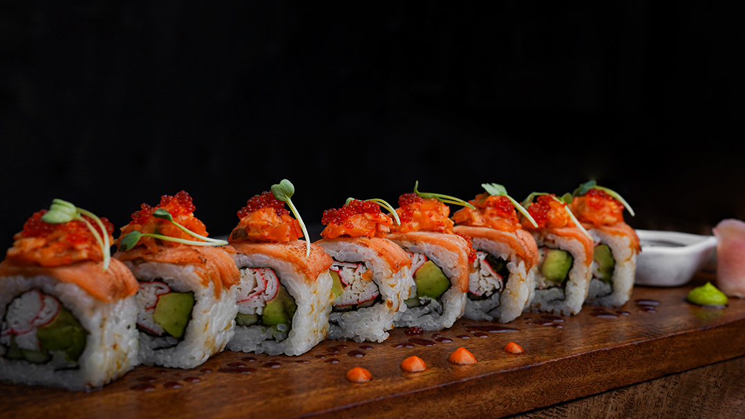 (8 PIECES ---- 950) (12 PIECES ---- 1,325) (16 PEACE ---- 1,650) SMOKEY BURN SALMON, AVOCADO, CUCUMBER JALAPEN̈O, CRAB STICKS, GINGER, WASABI, TERIYAKI SAUCE, SPICY MAYO. [GLUTEN FREE, NON-VEGETARIAN, DAIRY]