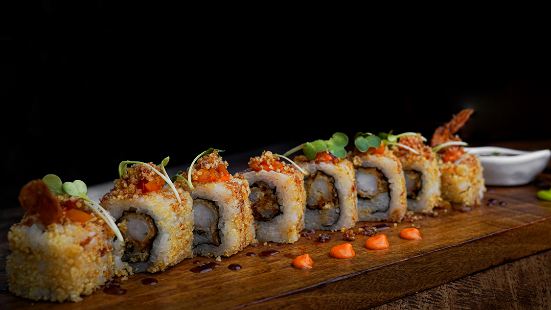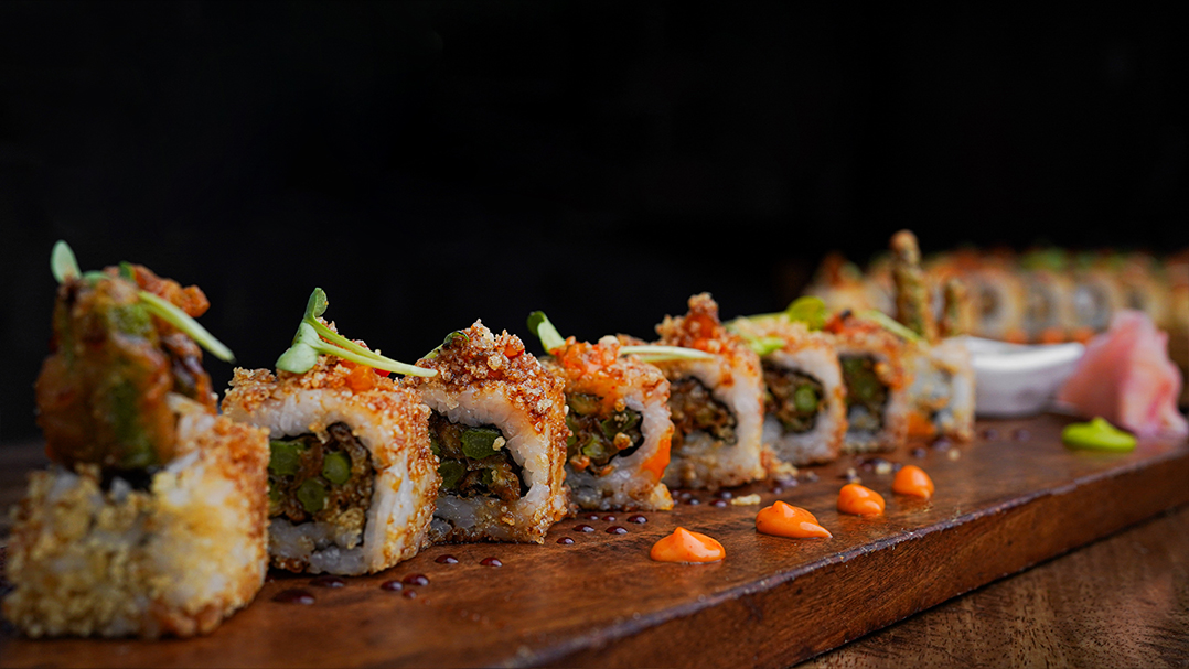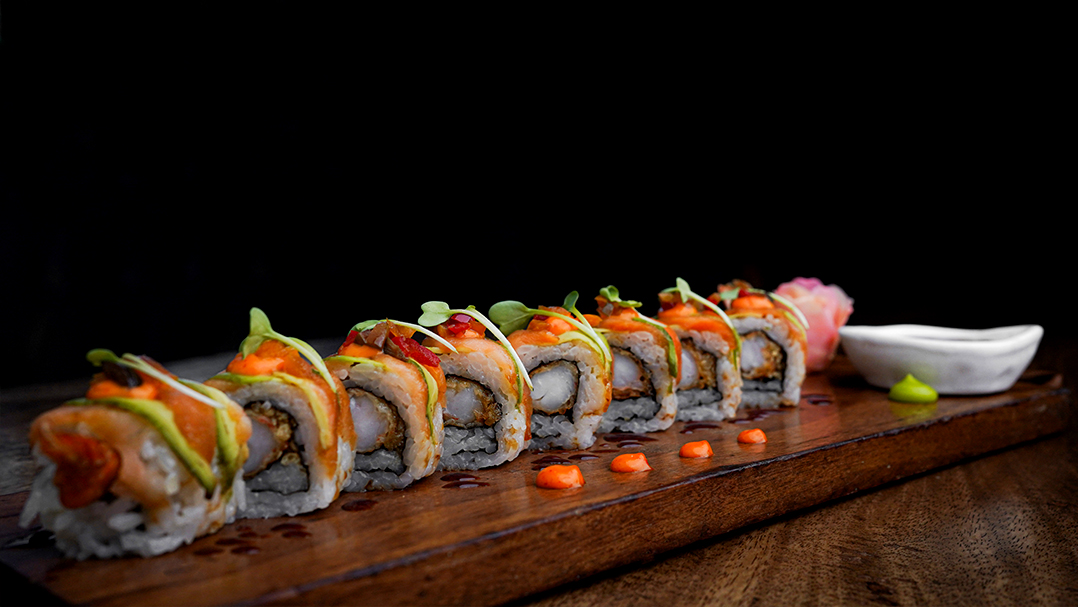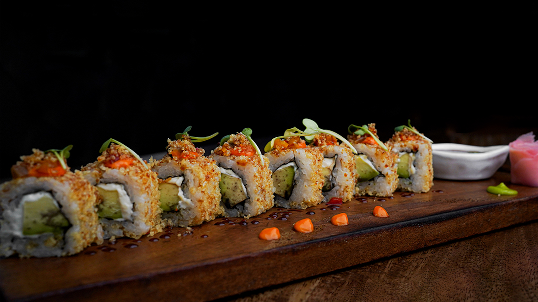 (8 PIECES ---- 895) (12 PIECES ---- 1,175) (16 PIECES ---- 1,450) BIG CHUNKS OF AVOCADO, PHILADELPHIA CHEESE, CRISPY TANUKI, SPICY MAYO, GINGER, WASABI, TERIYAKI SAUCE, MICRO GREENS. [GLUTEN, VEGETARIAN, DAIRY]